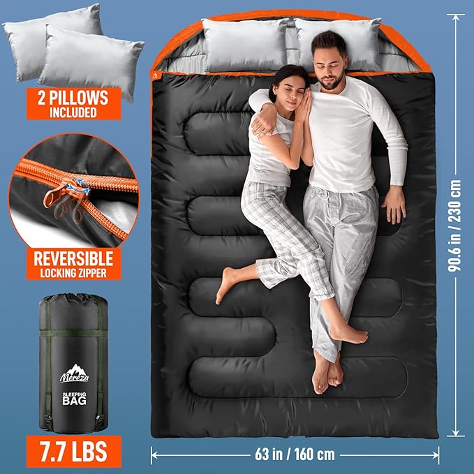 MEREZA Double Sleeping Bag for Adults Mens with Pillow, XL Queen Size Two Person Sleeping Bag for All Season Camping Hiking Backpacking 2 Person Sleeping Bags for Cold Weather & Warm