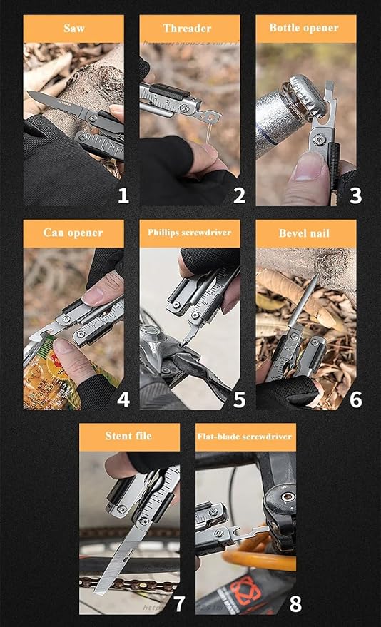 - Function: 1. Main knife 2. Bottle opener 3. Can opener 4. Taper 5. Double-sided file 6. Cross screwdriver 7. Flat-head screwdriver 8. Flat-head screwdriver (thin) 9. Measuring ruler 10. Circle Hole 11. Needle-nose pliers 12. Detonator crimping pliers 13. Wire removal pliers
