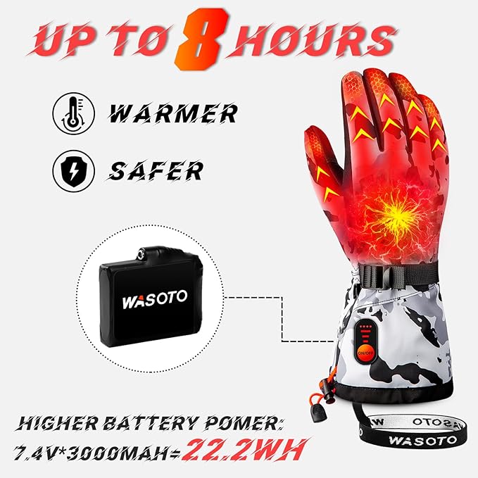 - Safer & Longer Battery: Safety is our first principle in producing heated gloves. Our batteries not only have FCC, CE international battery safety certifications but also have higher heating efficiency. Compared with others' 5V battery(Actual 3.7V), our 7.4V 3000mAh rechargeable battery heats up faster and lasts longer (A fully charged battery can last up to 8 hours at low level)