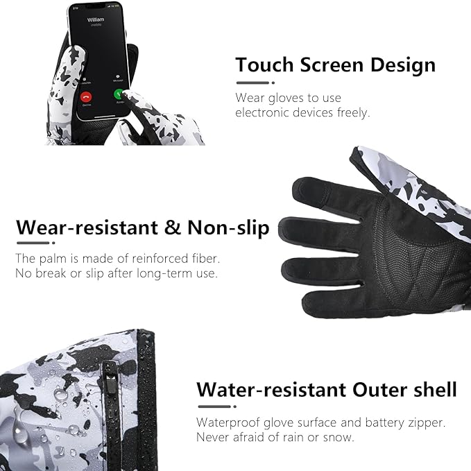- Durable & Windproof & Waterproof: The palm part is made of superfine fiber, which is more wear-resistant, more non-slip and has a longer lifespan than other gloves made of PU material. The surface of the glove and the battery pocket are designed to be waterproof and windproof. Keep your hands dry and warm while skiing, riding motorcycles, working, hunting, hiking, biking and other sports