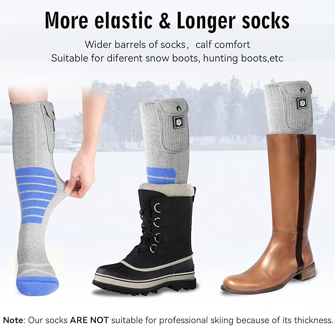 - 【Washable Material】Our heating socks are thicker and longer with wider barrels. The main materials include crystal fleece, modal core yarn and spandex, soft, breathable, super stretchy and anti-pilling. Note: Due to the thickness, our socks are not suitable for professional skiing. But it will be a good choice for those who need thicker thermal socks.