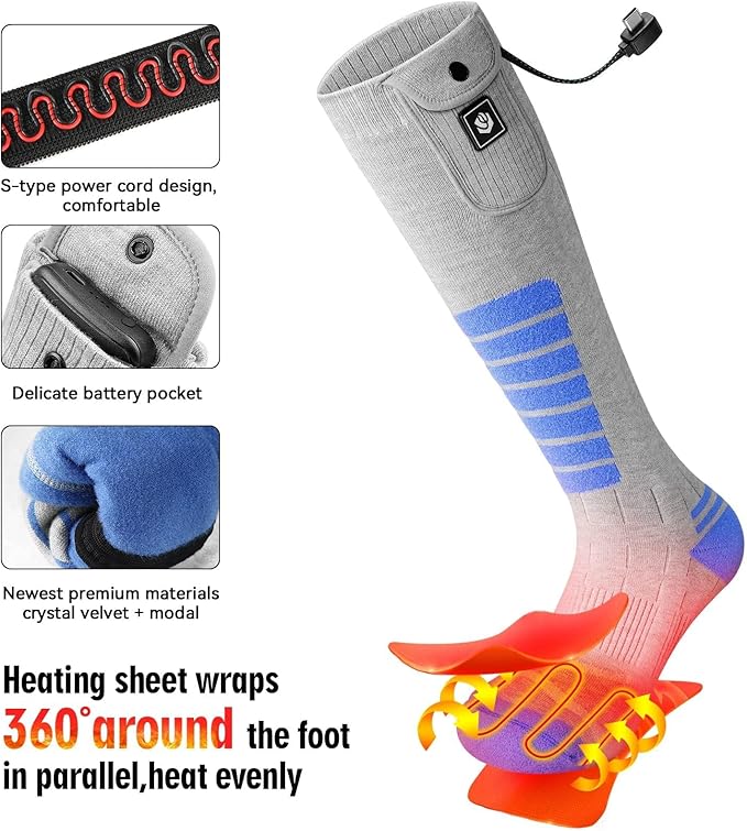 - 【360° Even Heating】Our Upgraded electric socks replace the traditional heating wire with a heating sheet,which has a larger heating area. The heating is even, won't burn your feet and promote blood circulation. It is helpful for outdoor sports enthusiasts, people who are afraid of cold, arthritis or Raynaud's syndrome.