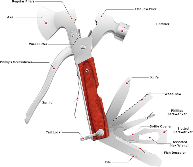 - 【16 functions in one】including hammer, grub screw, wire cutter, needle-nose pliers, vise, saw, bottle opener, Phillips screws, files, fish descaler, hex wrench, springs, handles, etc.