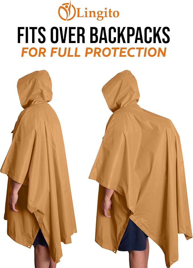- VARIETY OF USES: Lingito's hooded rain ponchos aren't just meant to be worn, they offer multiple ways that can protect you from outdoor elements. You can use it as a camping blanket if in case the ground is wet, or you can prop it up above as a sun shade. The ponchos come in a 3.5" x 9" bag and weighs only 11 oz. Put it in your book bag, duffle bag or purse and be ready for any trip.