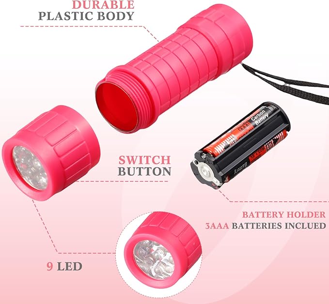 - Easy to Use: each flashlight is packed with enough AAA batteries; These batteries provide enough energy for the flashlight; It can be turned on or off with a simple button operation; Three lighting conditions can be applied freely as you wish; 9 LED spotlight beads bring you nice lighting conditions