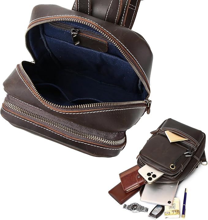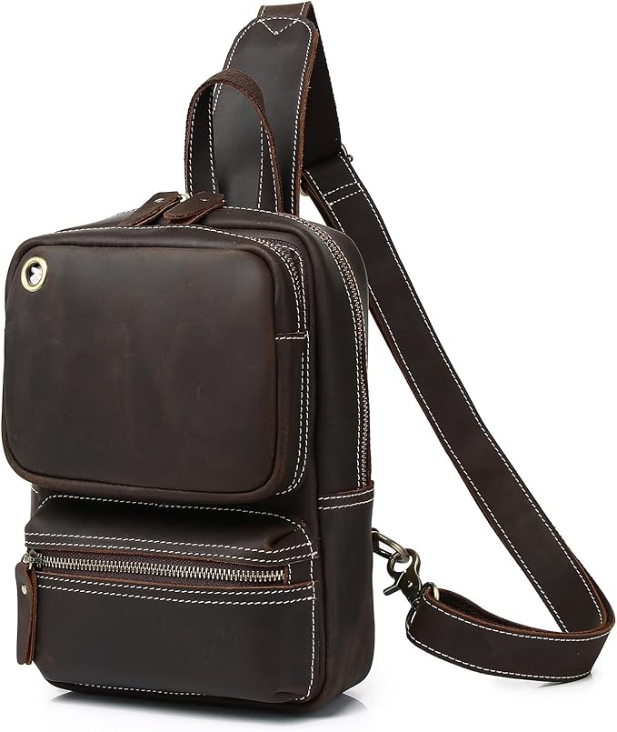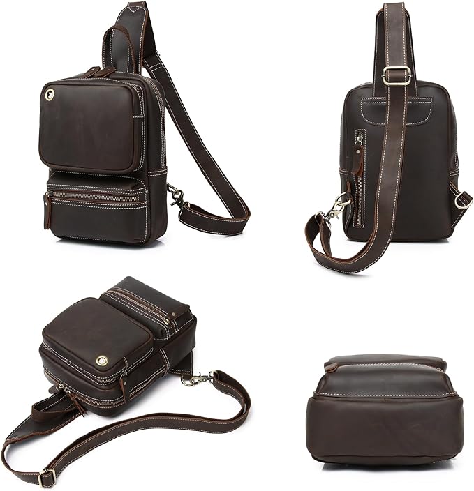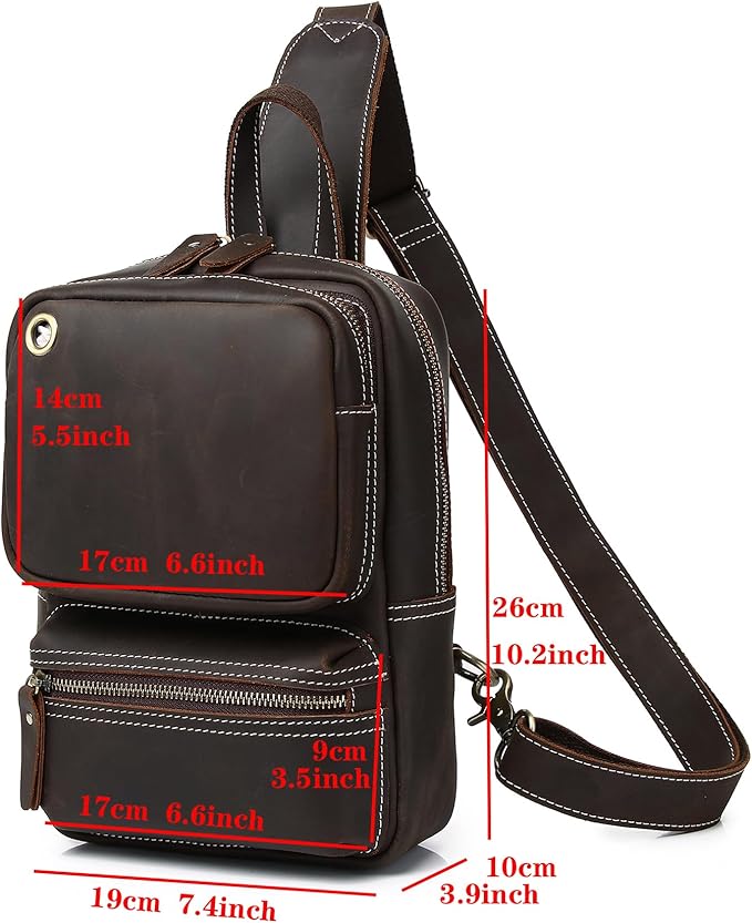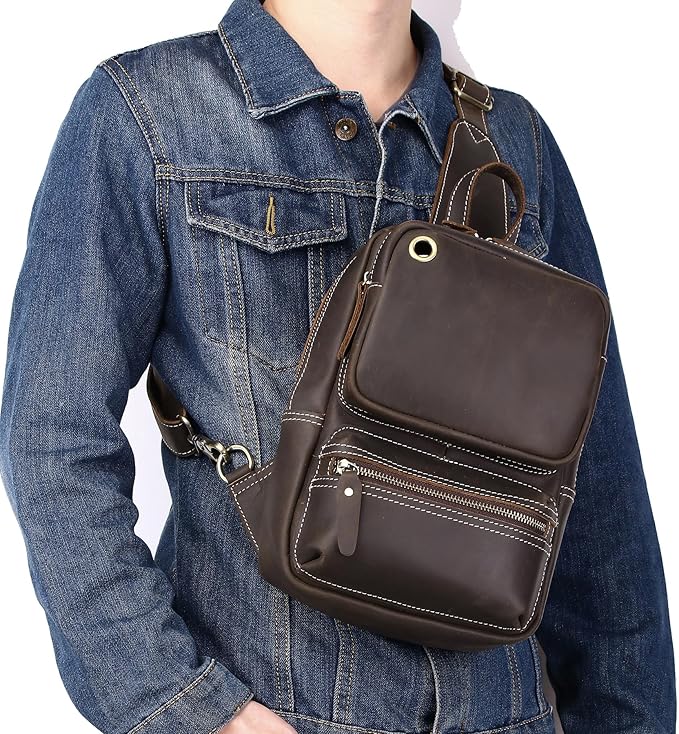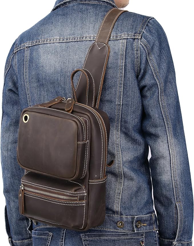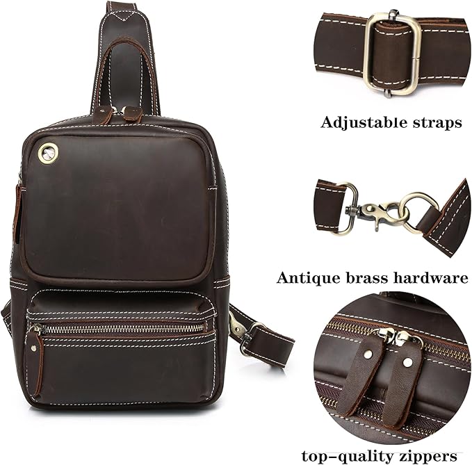 KPYWZER Crazy Horse Genuine Leather Sling Bag for Men Women Shoulder Backpack Satchel Crossbody Chest Casual Outdoor Daypack Deep Brown