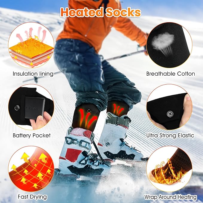 - [Comfortable and Breathable] Our rechargeable socks are made of high-quality material which is comfort, breathability, elasticity and absorbency. They protect your entire frozen toes during winter. It is suitable for walking in the snow, skiing, hunting, as well as other work or recreation activities in cold weather.