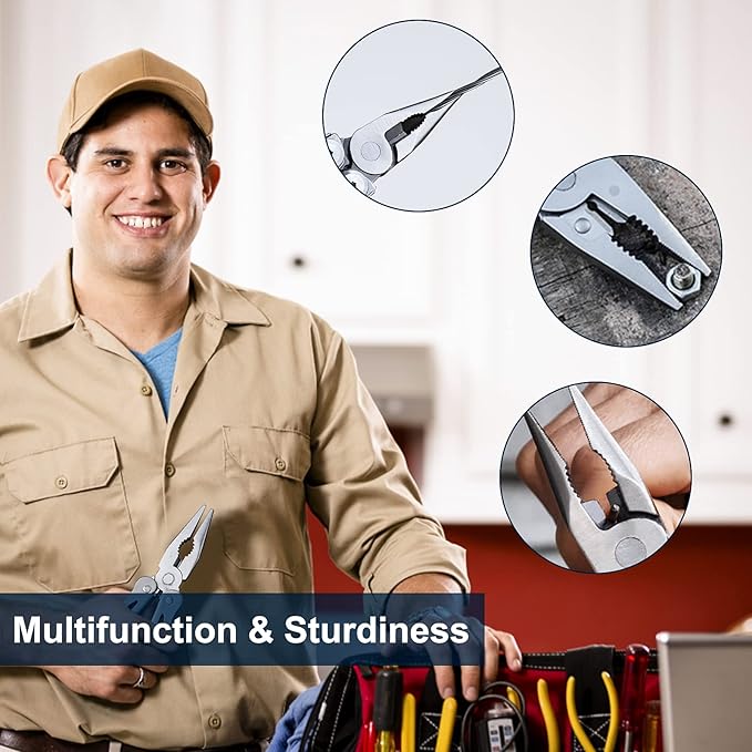 - Convenient & Practica: 24 in 1 Multitool Plier-Hardened stainless steel design, including needle nose plier, regular plier, wire cutter, nail puller, screwdriver hole, wrench, slotted screwdriver, knife, steel file, wire cutter, screwdriver set, bottle opener, serrated knife, regular pliers, ruler. It comes in very handy for small jobs/repairs/home DIY projects in and around the house