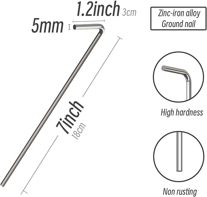 - Heavier and Stronger - 32g heavier than others making it strong enough, the 5mm diameter heavy-duty steel pole is galvanized, making the camping stakes ideal for long-term outdoor use.