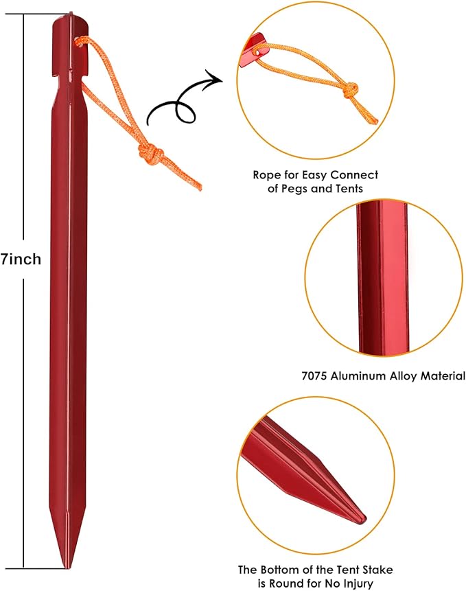 - 2. [ PACKAGE CONTENT ] 12Pcs 7 inches tent pegs with reflective pull cords + 1pcs carrying pouch. Camping spikes are available in rocky place desert snowfield and grassland. Throw it in your backpack and go!