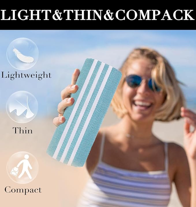 - [Lightweight & Save Space]: It can be rolled up neatly to pack and put it to its own bag. Less storage space for travelling, take up about the space of a little more than a pair of socks. Easily stack in your package, so ditch your heavy sand-covered towel and streamline your summer.