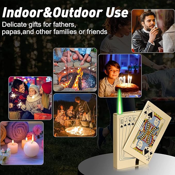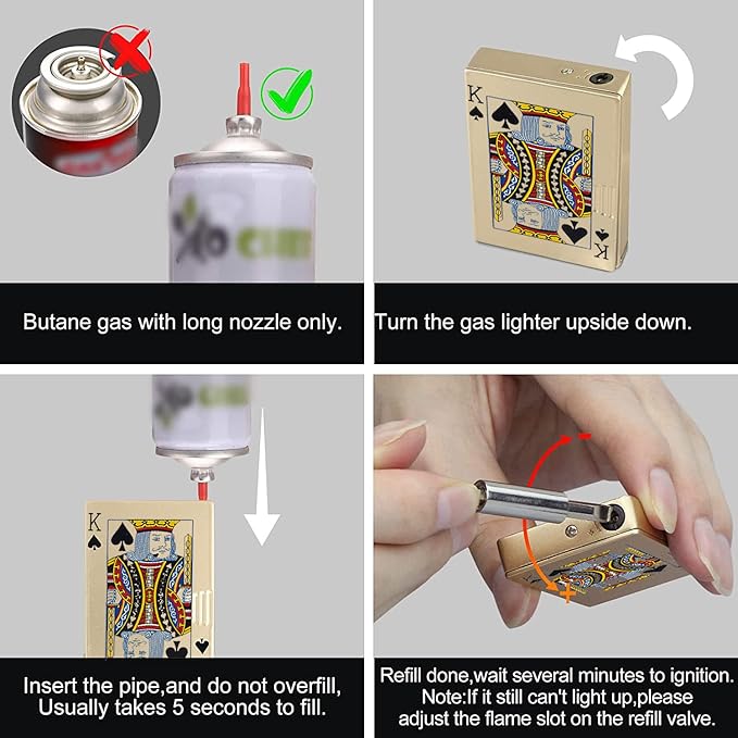 - 【Cool Design Widely Versatile】This Cool design lighter is made process with multi-layer electroplating process, poker pattern on the front, no fading.Butane Refillable Lighter is Perfect as outdoor activities such as hiking, bonfire, camping trips, camping stove, make fire outdoors and so on, and also Useful Lighting your Fireplace, Candles, for Hobby, Arts and Crafts Projects, for Multiple Camping Applications.