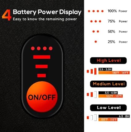 - 【Safer & Longer Battery】Compared with others' 5V battery(Actual 3.7V), our 7.4V rechargeable lithium battery provides faster heating speed and better performance at low temperature, and higher energy(7.4V*3000mAh=22.2Wh) brings up to 8 hours warmth(At low level&full charge). In all, our UL,FCC,CE certified battery keeps you warmer and safer.