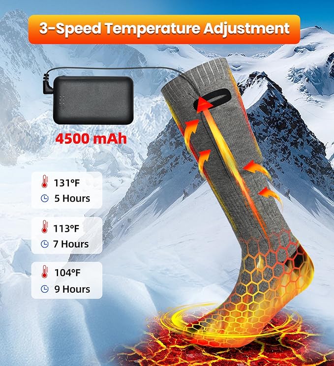 - 【LARGE CAPACITY BATTERY】G6is98kb Heated Socks Include pair of 3.7V 4500mAh lithium polymer batteries. Heating Up to 5-9 Hours and full charge around 4-5 hours. Keep Warm All Day!