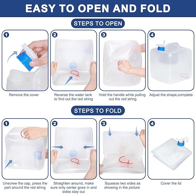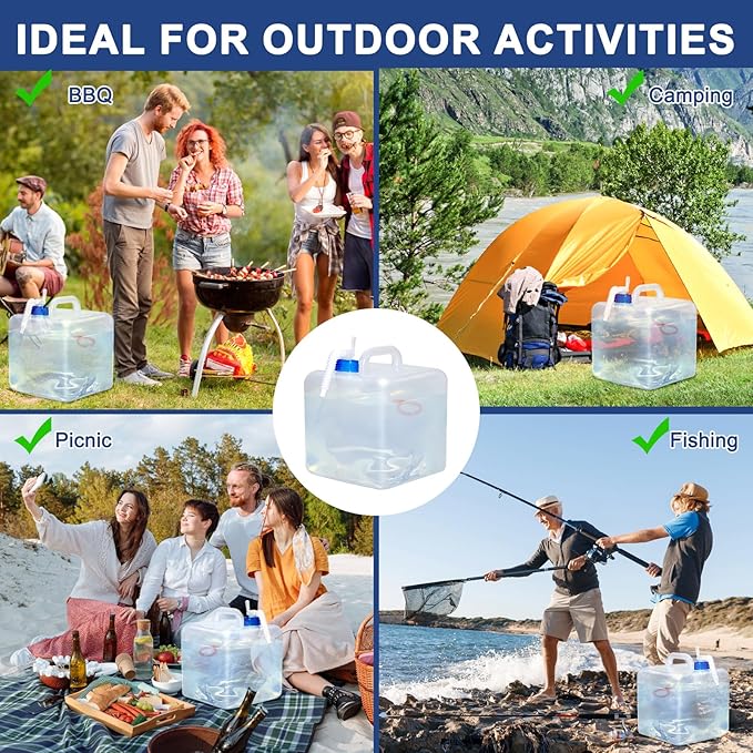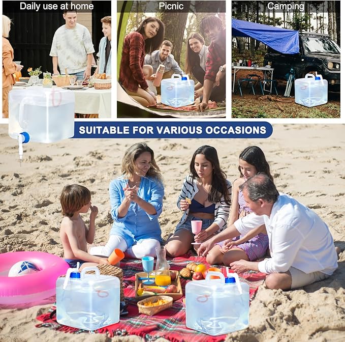 - Light and reusable: Our water container with spigot is easy to fold,which can saving 75% space after folding.After folding,you can easily put in your backpack,when you need it,just take out and it can be use repeatedly.Not only does it not take extra space before use, but it also saves space during use.Ergonomic handle makes it more comfortable and sturdy to grip,you can use it anywhere,anytime.