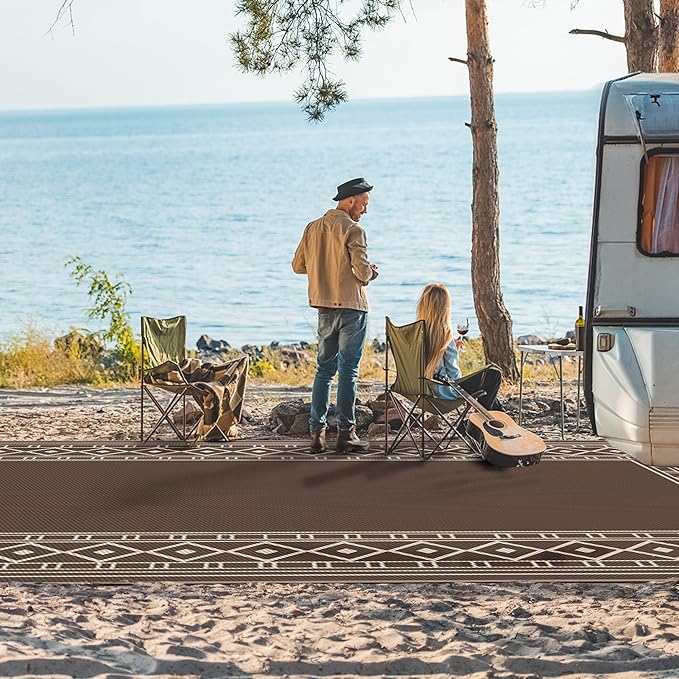 GENIMO Outdoor Rug Waterproof for Patio, 10'x14' Foldable Reversible Plastic Straw Carpet for Travel Trailers, Outside Area Mat for Rv, Deck, Picnic, Porch, Camper, Balcony, Beach, Coffee & Beige