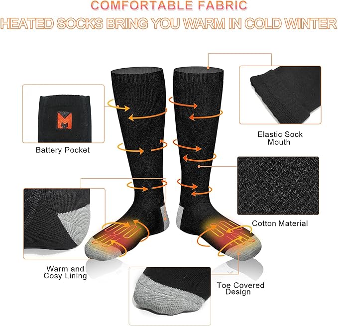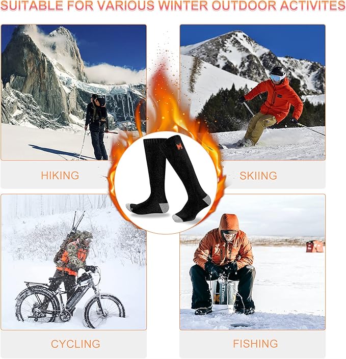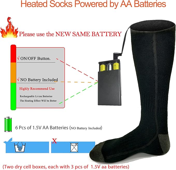 - 【Safe and Long-Lasting Warm Socks】: Heated socks are equipped with 2 battery boxes, powered by 6*AA 1.5V batteries (not included), which providing you with up to 5 hours enduring warmth.