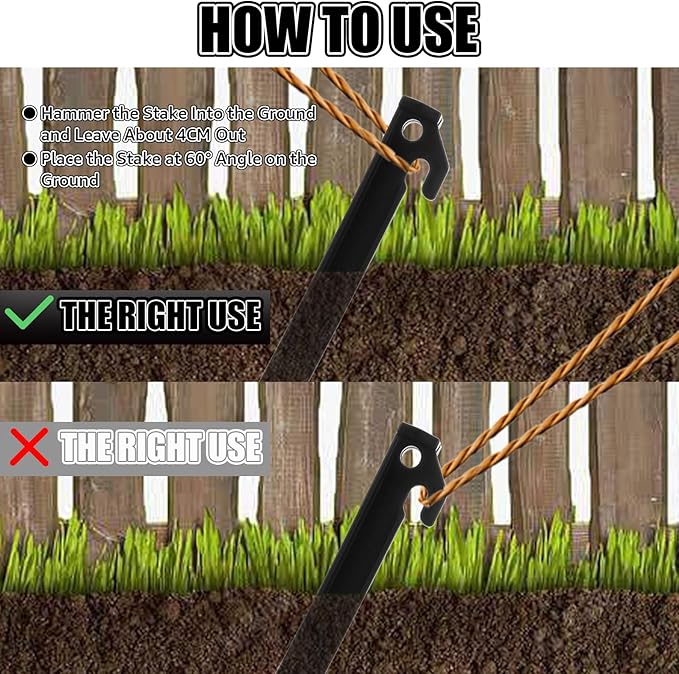 - EASY TO USE: You just need to insert the heavy duty tent pegs into the ground at a suitable Angle, and then tie one end of the nail to the peg with a rope, and the other end to the corner of the tent, so that the various parts of the tent can be firmly fixed, easy to disassemble, and not easy to fall even if the wind is strong