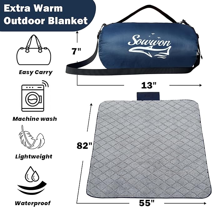 - BIG ENOUGH, LIGHT ENOUGH AND WARM ENOUGH - 82" X 55" Large waterproof stadium blanket(2.2 lbs) is large enough to wrap 2 people and 3-6 to sit on respectively. It has two drawstrings for tightening around the body. The blanket is made from an 280gsm polar anti-pill material that is able to keep you comfortable and warm at the same time.