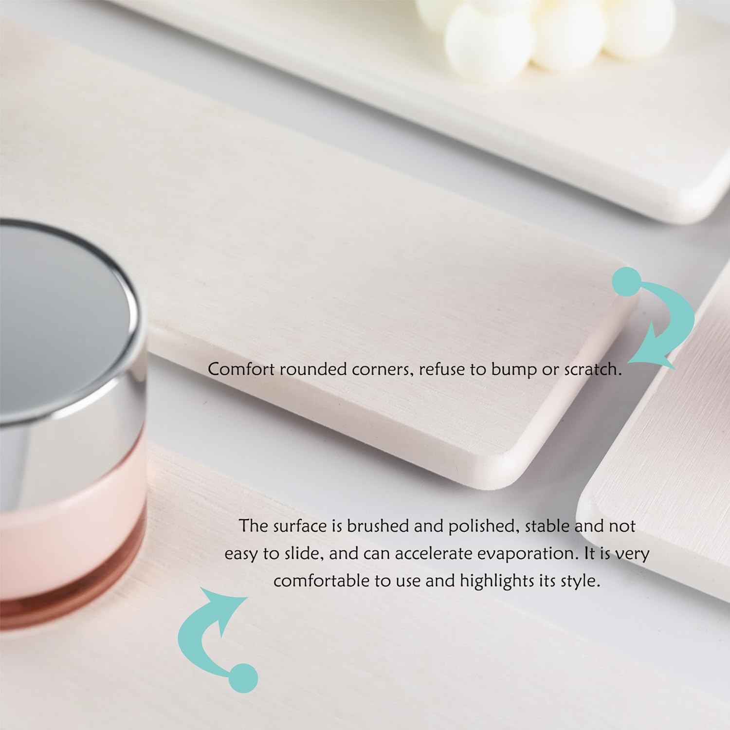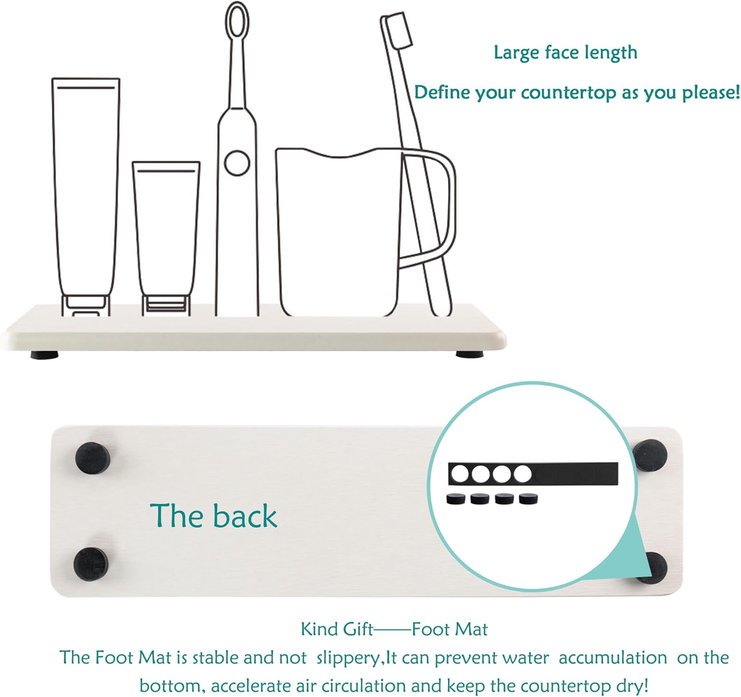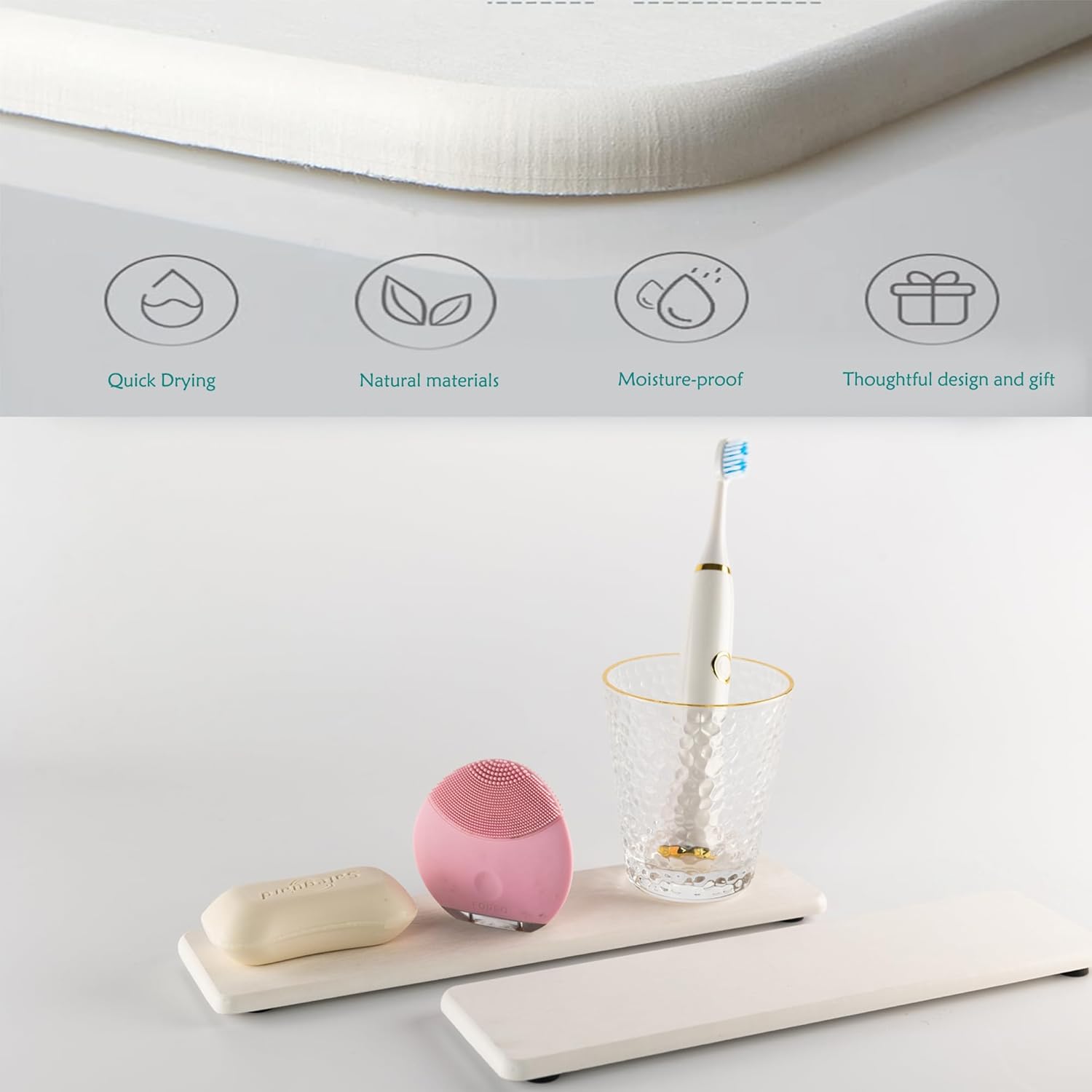 - Made from natural Diatom mud and plant fiber, small holes within diatomite enable it have amazing water absorption. They could absorb water and gets dry in a few minutes. It makes the Bathroom Counter top more dry and tidy.