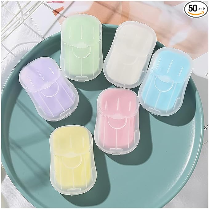 50Pcs Blue Portable Soap Sheets, Mini Portable Travel Soap Paper Sheets Disposable Water Soluble Hand Washing Bath Scented Paper Soap Camping Soap and Shampoo for Outdoor, Camping Hiking