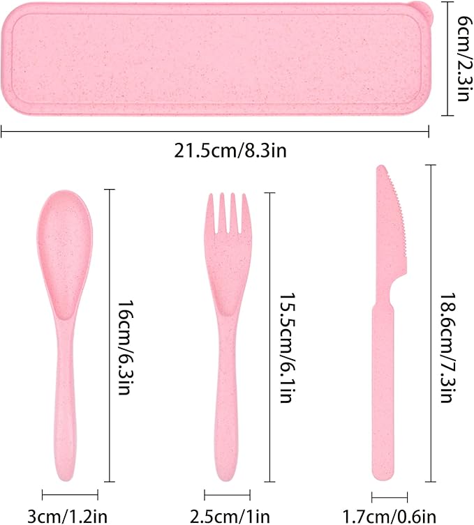 - 【Reusable Cutlery Set with Case】 Portable cutlery set is included one fork, one spoon, and one knife.Case box-21x6x2.5cm/8.3x2.3x1inch; Knife-18.6cm/7.3inch; Spoon-16cm/6.3inch; Fork-15.5cm/6.1inch.