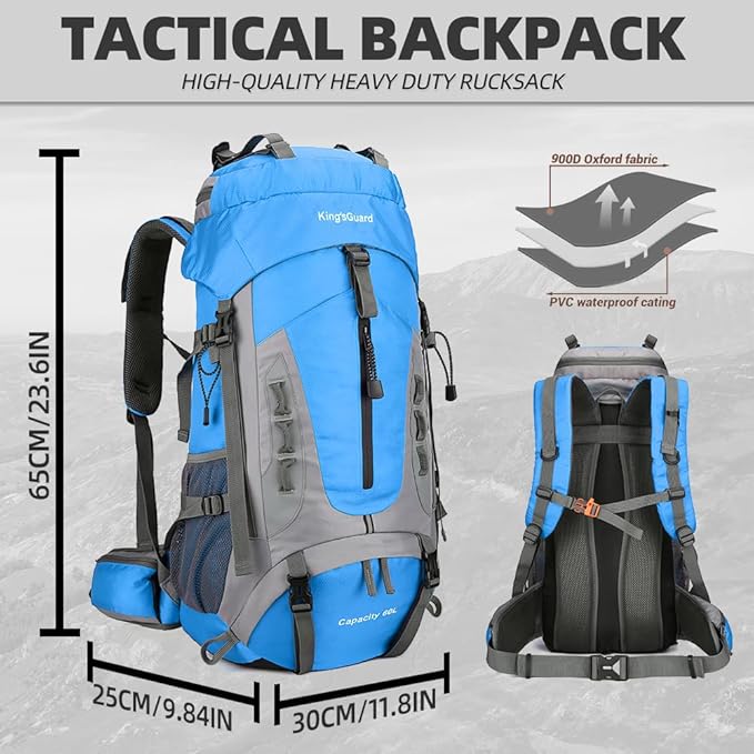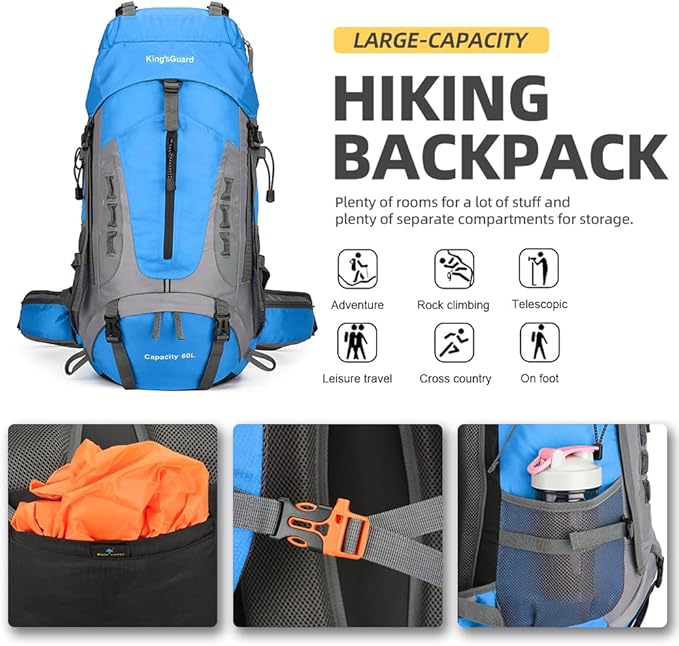- 【High Quality Outdoor Backpack】- Choose the kings guard 60l backpack for your outdoor adventures and enjoy the perfect blend of functionality, durability, and comfort. This large hiking backpack is not only perfect for hiking and camping, but also great for travel, backpacking, and other outdoor activities. 【ONE YEAR QUALITY SUPPORT】
