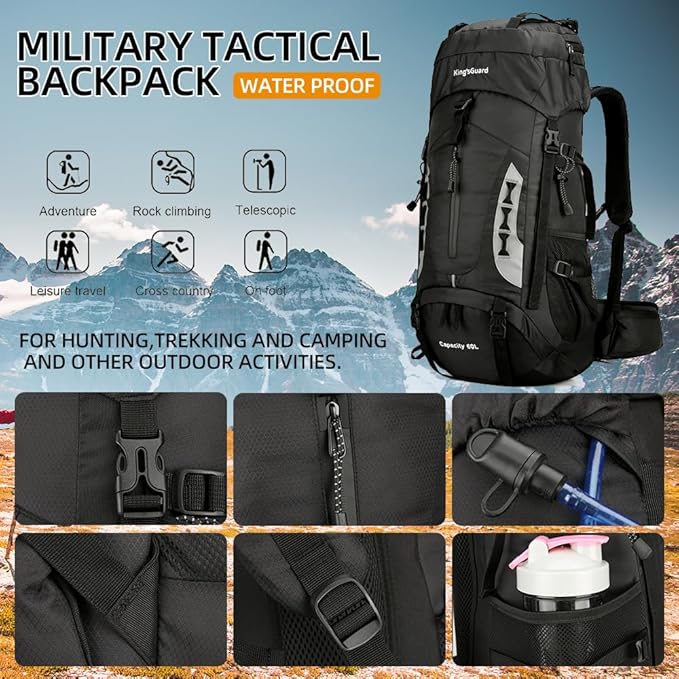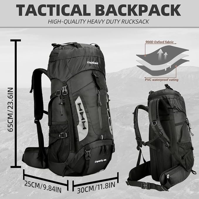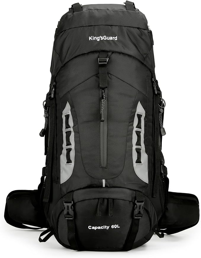 - 【High Quality Outdoor Backpack】- Choose the kings guard 60l backpack for your outdoor adventures and enjoy the perfect blend of functionality, durability, and comfort. This large hiking backpack is not only perfect for hiking and camping, but also great for travel, backpacking, and other outdoor activities. 【ONE YEAR QUALITY SUPPORT】