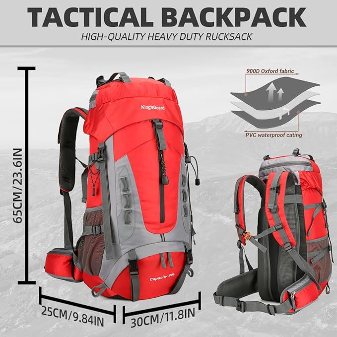 - 【High Quality Outdoor Backpack】- Choose the kings guard 60l backpack for your outdoor adventures and enjoy the perfect blend of functionality, durability, and comfort. This large hiking backpack is not only perfect for hiking and camping, but also great for travel, backpacking, and other outdoor activities. 【ONE YEAR QUALITY SUPPORT】