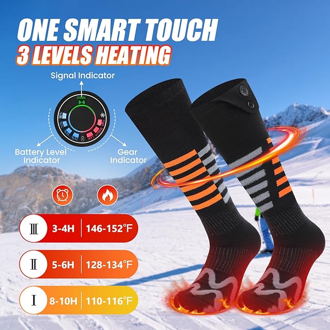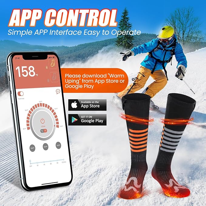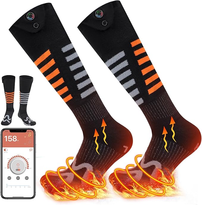- 🔥BUTTON OR APP CONTROL:2023 newly upgraded heated socks, get rid of the cumbersome operation of battery control, put the temperature control button on the heated socks, of course you can also control it through the cell phone APP, Level 1: 104±3 °F (8-9 H), Level 2: 122±3 °F (7-8 H), Level 3: 141±3 °F (4.5-5 H)
