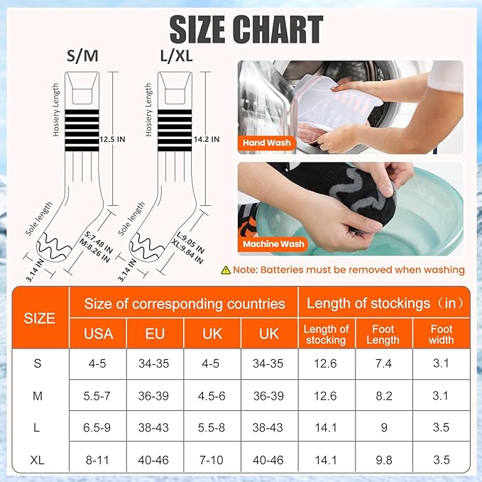 - 🔥SAFE HEATING COVERING THE ENTIRE FOOT: The heating element in these heated socks has been upgraded to a longer, larger heating element. The heating zone has been upgraded from the toes to the front of the foot. Concentrating the heat on the front of the foot, the heating element of the electric socks 360°All-Round Heating. With winter heating socks, your toe area will warm up quickly and keep your entire foot warm.