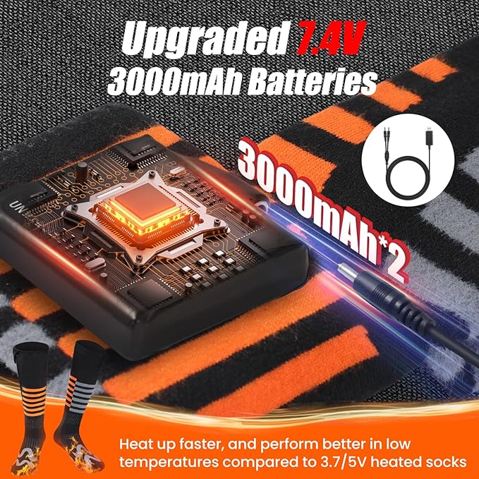 - 🔥HIGH CAPACITY BATTERY: Rechargeable Battery heated socks equipped with 7.4V 6000mAh rechargeable battery, the heating time is longer and faster than 3.7V and 5V Heated Socks, the women's heated socks can work for up to 10 hours,In addition, the latest Type-C connector on the Winter Heated Socks provides fast charging, allowing the battery to be fully charged in less than 4 hours, so this electric heated socks will have you warm in no time.