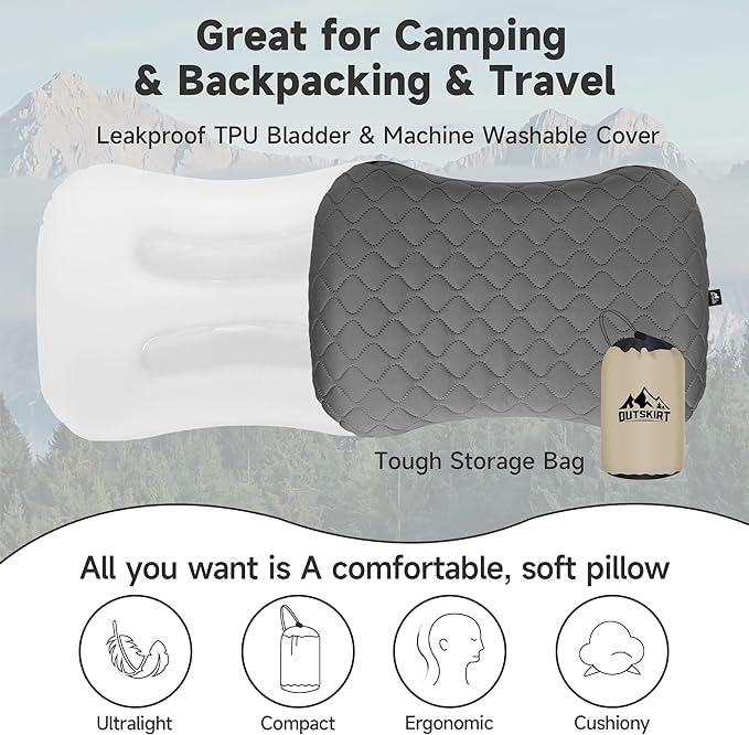 OUTSKIRT Inflatable Camping Pillow, 2-in-1 Travel Pillows for Sleeping, Ergonomic & Lightweight Small Backpacking Pillow for Travel, Hiking, Camping & Outdoor Activities, Grey