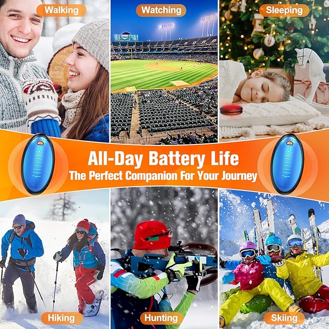 - 🔥【Long-Lasting Heated Hand Warmer】Our rechargeable hand warmer is ergonomic design can be held perfectly in your hand and easy to carry. Perfect for outdoor sports, camping, hunting, hiking, from outdoor activities to the office, school, and long-distance travels. A topical hot compress can eliminate fatigue and relieve pain. For Raynaud arthritis sufferers, heat therapy demanders, and groups who are prone to cold hands and feet, hand warmer is a must-have to help you spend a cozy winter.