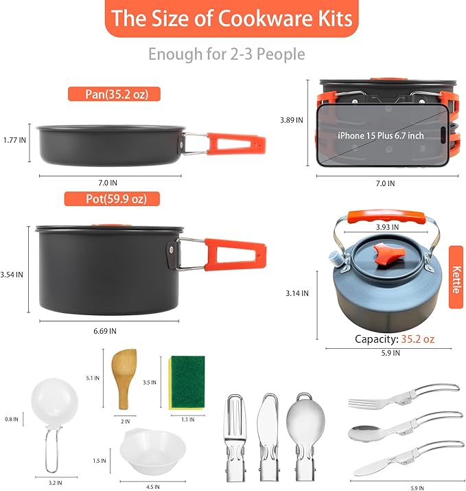 - Camping Cookware Mess Kit🏕️: the 13pcs Camping Cookware Mess Kit Is Perfect for 1-2 People. Package Includes: 1 X 59.9oz Camping Pot (6.69*3.54 Inch),1 X 35.2oz Frying Pan(7*1.77 Inch),1 X 35.2oz Camping Kettle,3 Bpa Free Silicone Folding Bowl ,1 Silicone Folding Spoon with 1 Carabiner,1 Rice Spatula,1 Loofah Slice,1x Net Bag for Storage.