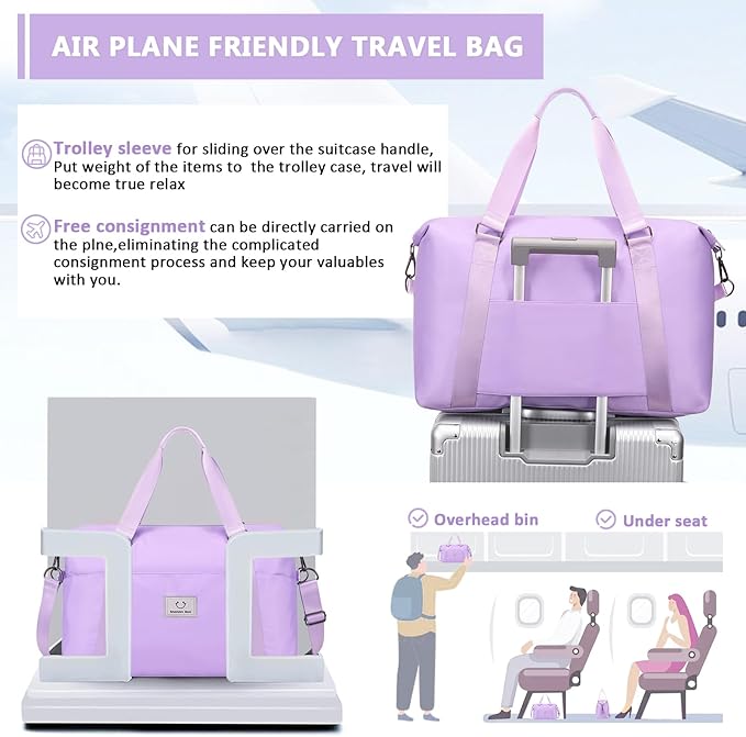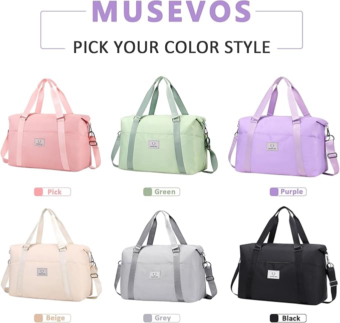 - AIRPLNE FRIENDLY TRAVEL BAG:MUSEVOS lightweight duffle bag for women can be directly carried on the plane, eliminating the complicated consignment process and keep your valuables with you. And the travel bag with trolley sleeve for sliding over the suitcase handle, put weight of the items to the trolley case, travel will become true relax airline travel. Your ideal overnight weekend boarding bag for business or personal travel.