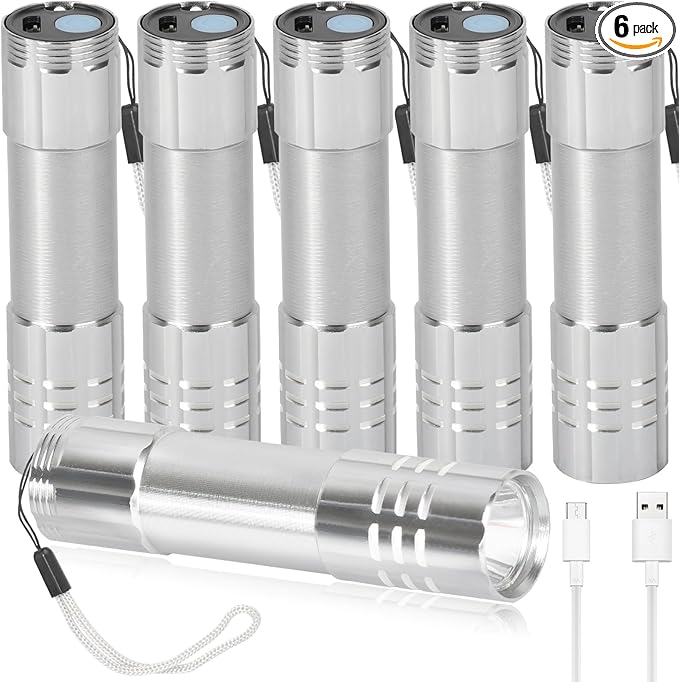 6 Pack LED Aluminum Small Mini USB C Rechargeable Flashlights, Handheld Small Flashlight Bulk for Kids, Portable Camping Bright High Lumens Flashlight Christmas Gifts (Silver)