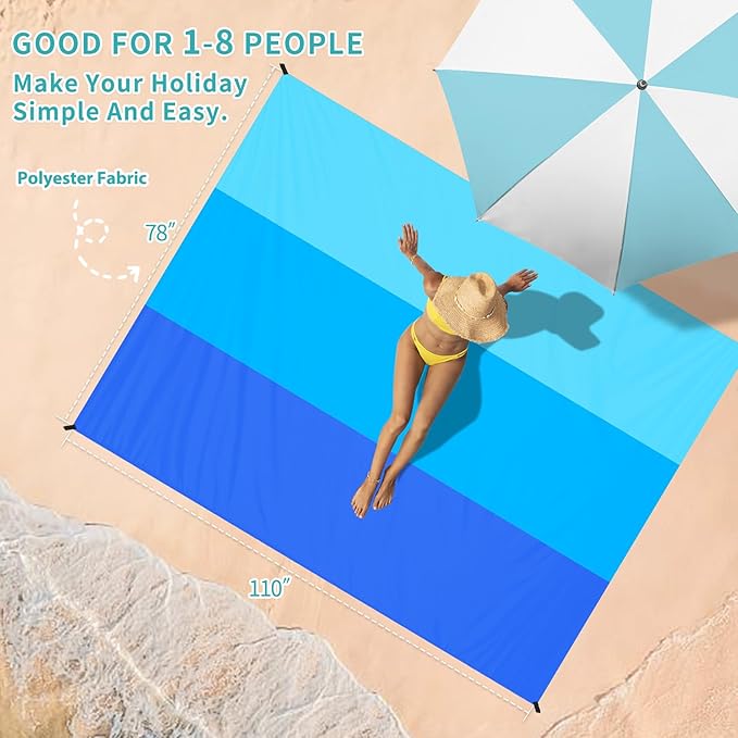 - 🌴Beach Blanket Waterproof Sandproof:78''×110''size beach blanket,suit for 1-7 adults.Made by parachute fabric,odorless,tear-resistant 210T polyester.Light weight and small after folding.Only 15 oz,small and mighty,which is easy to carry!