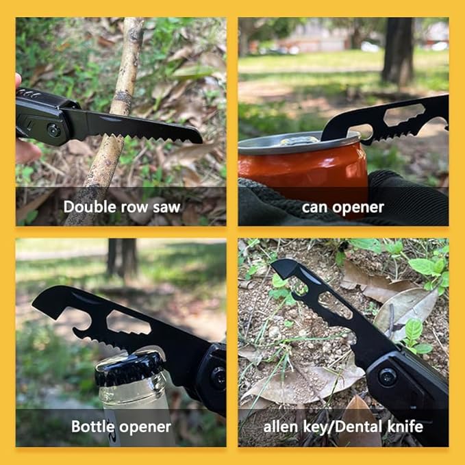 - The enhanced functionality continues with a double-row saw, steel file, bottle opener, hex wrench/serrated blade, can opener, main knife, and bit adapter. Be prepared for any situation, whether camping, hiking, or handling home repairs.