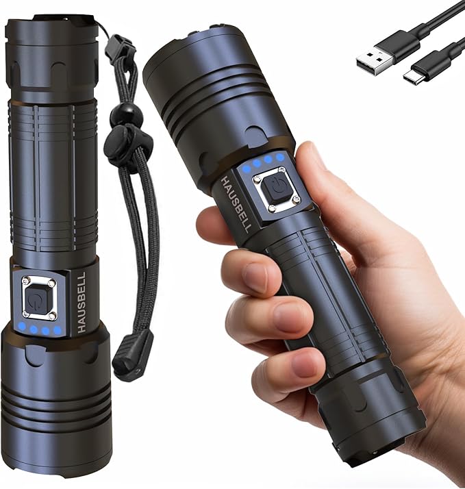 HAUSBELL Rechargeable LED Flashlights High Lumens, 20000 Lumens Super Bright Zoomable Waterproof Flashlight with 5 Modes, Input and Output, Powerful Handheld Flashlight (A300-2 Pack)