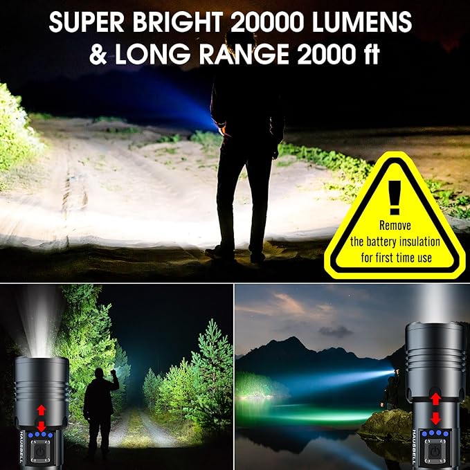 - ULTRA SEARCHLIGHT: With an built-in battery, our rechargeable flashlights Illuminate your adventure with producing 20,000 lumens of brightness and a range of up to 1000 feet, while the maximum life-span is 5,000 hours