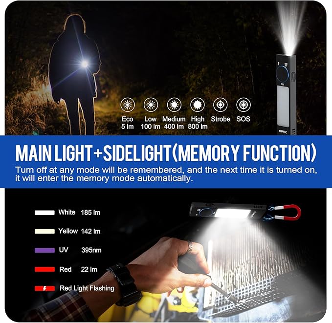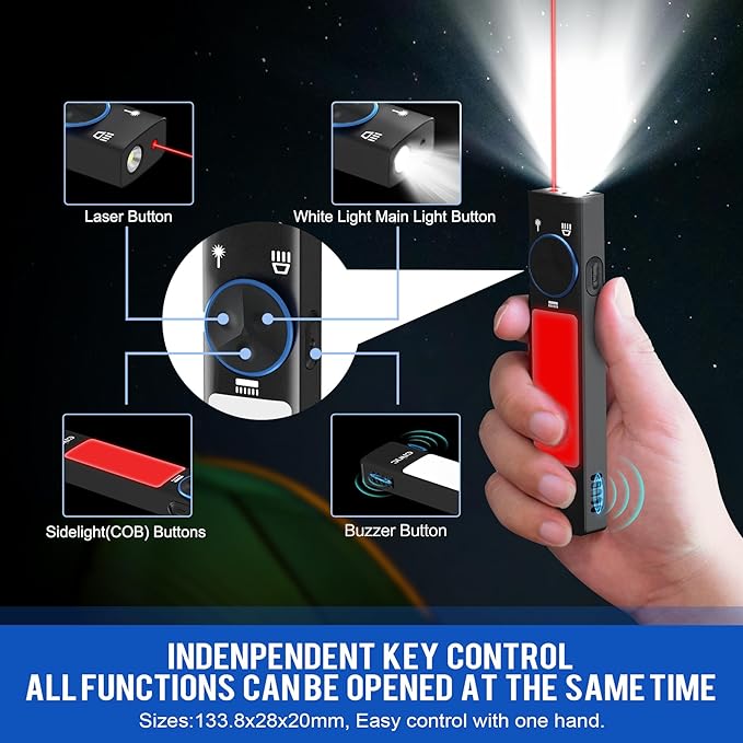 - 🔦🌟 Flashlight has 11 lighting modes, each function is controlled by a separate button, so multiple functions can be turned on at the same time, which can be done with one-handed control for easy operation. Strong magnet on the tail, combined with a variety of COB sidelights can be expanded into a maintenance light, warning light and so on.