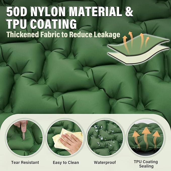 - 【50D Durable Ripstop Nylon】Made of lasting 50D nylon and TPU coating, 10D more than the old version, the camping mattress is waterproof, wear-resistant and more durable that is good for every weather, condition and terrain. It’s the best friend for camping, travel, hiking, fishing, climbing, etc. Weight Capacity is powerful enough to support, and just enjoy the sleeping pad while using it.