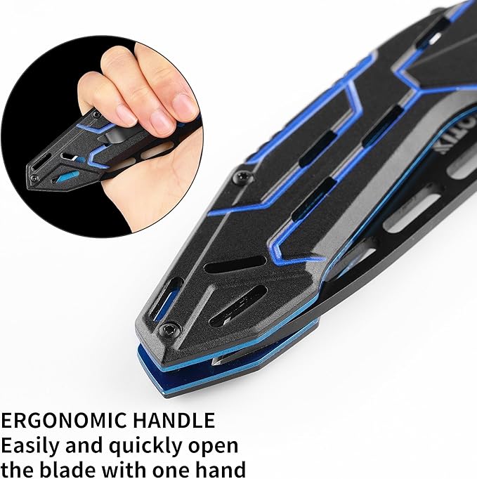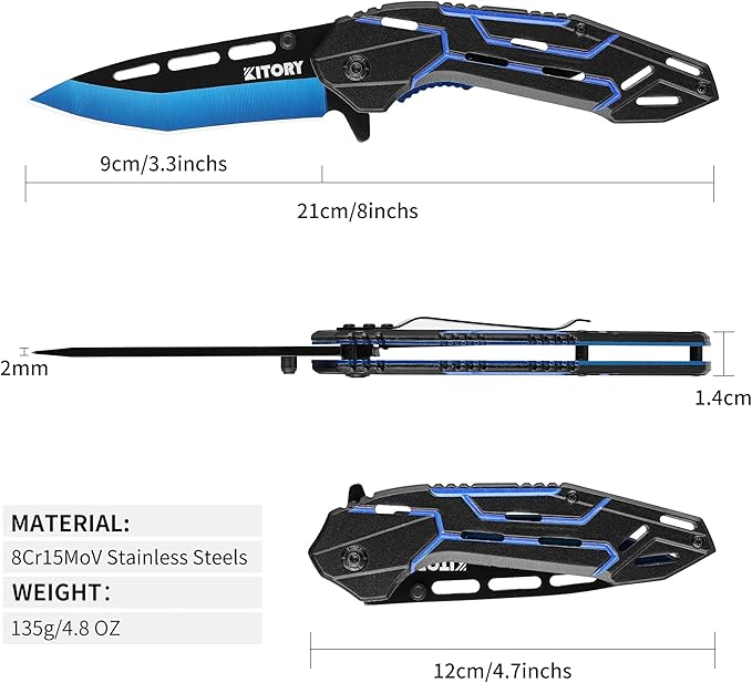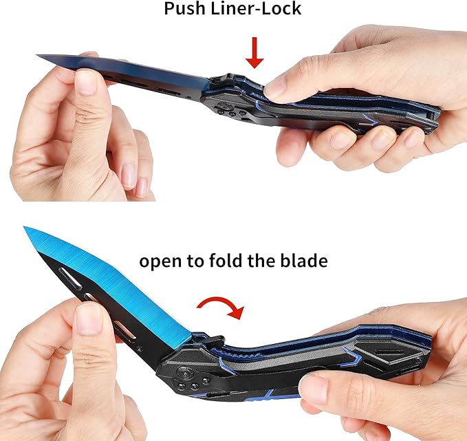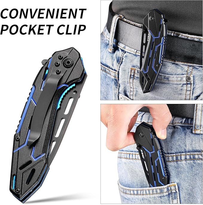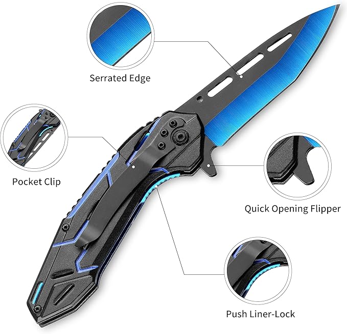- 【100% Satisfaction Guarantee】: If you are not satisfied with our products, please feel free to contact us, we will provide you with the best service. It's the perfect pocket knife for dad, designed with precision for tactical use. This blue, serrated pocket knife with a clip is not only cool but also extremely sharp.