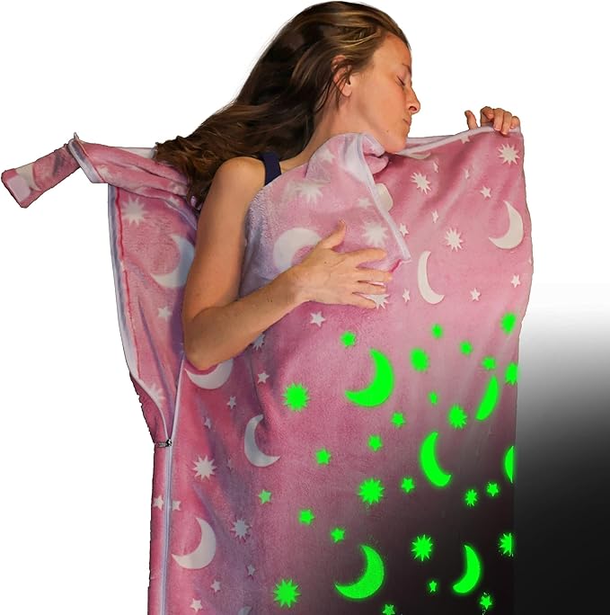 - Large Fleece Blanket: Unzip this magical travel sheet sleep sack to reveal a generous sized 70" x 62" glow in the dark blanket. When you need camping blankets for cold weather, this liner is the perfect sleeping bag blanket for adults or kids to wrap themselves in cozy warmth around the campfire after a day of thrilling adventures.