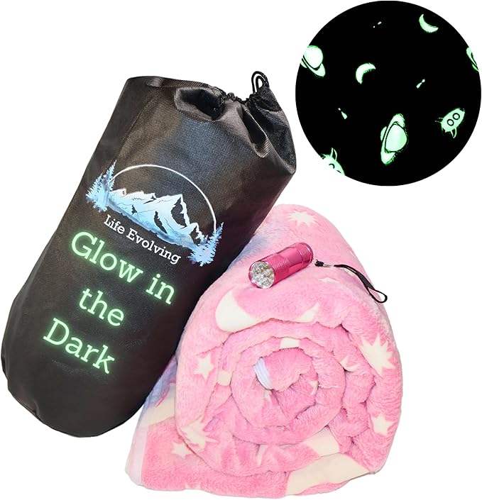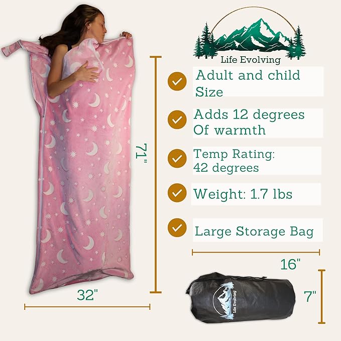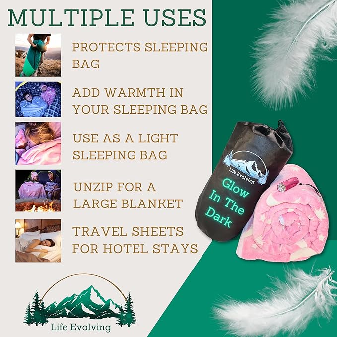 - Large Enough For Adults, Fun Enough For Everyone: The LifeEvolving 71"x 32" glow In the dark blanket sleeping-bag liner turns every night, whether under the stars, in a tent or staying in a hotel, into a celestial adventure. This 4 season sleeping bag makes a cozy travel bed for adults or anyone in the family!