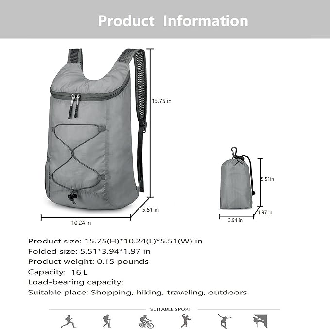 - LIGHTWEIGHT &16 L CAPACITY:The lightweight hiking daypack weighs only 2.82 ounces.unfold size: 10.23 (L) * 15.75(H)*5.51(W)inches,after folding size: 3.94(L)*5.51(H)*1.97(W)inches,the bag folds to the size of a sandwich and fits in a pocket.The main pocket to carry what you need,side pockets for water bottles or umbrella.