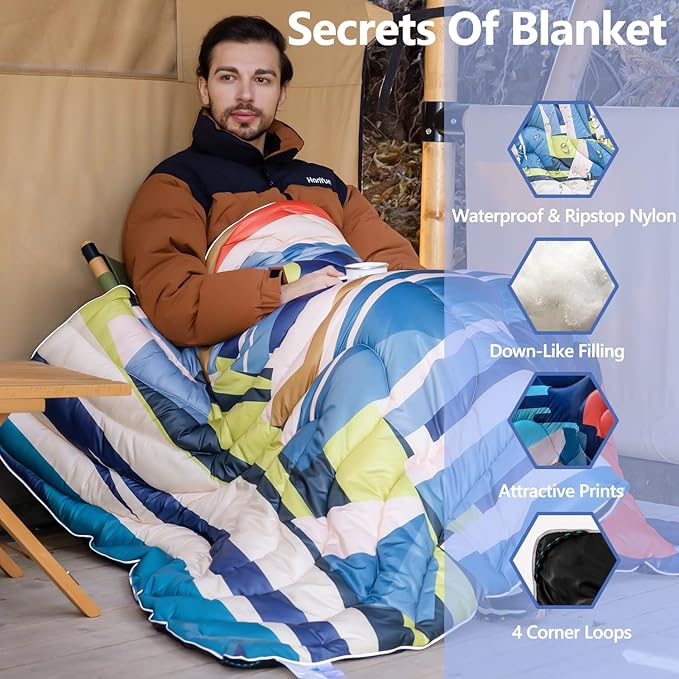 - Waterproof and Durable: Made with high-quality 20D ripstop nylon fabric, our quilt for camping is built to withstand all kinds of weather conditions. The waterproof coating ensures that you stay dry even in the wettest conditions.