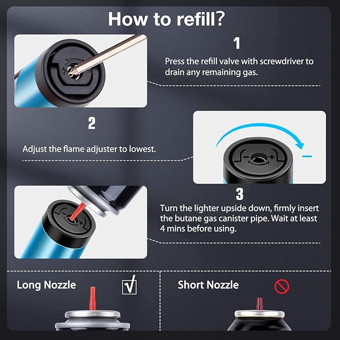 - REFILLABLE & ADJUSTABLE FLAME: No need for any tools, you can easily adjust the flame height by turning it by fingers. Compared with disposable lighters, it can be refilled and used repeatedly, which is more environmentally friendly