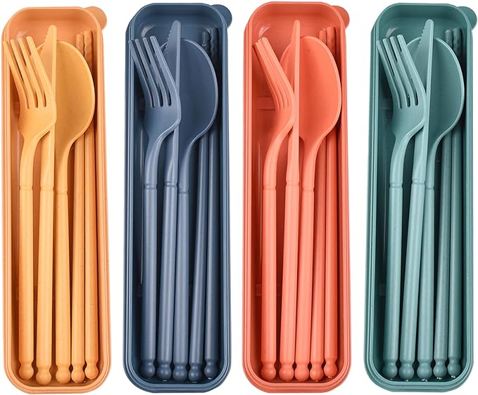 - Package Includes: Portable cutlery with 4pcs reusable plastic cutlery, Each cutlery case set is included one fork, one chopsticks, one spoon and one knife.